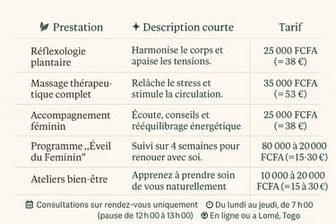 Chaque séance est un moment unique, sur rendez-vous, en ligne ou à Lomé (Togo).